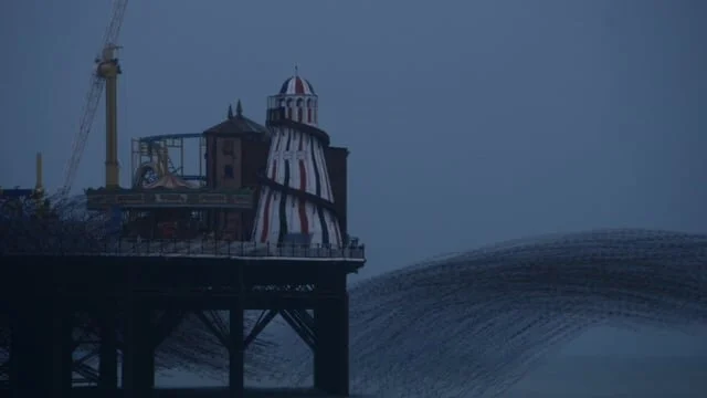 Chronophotography, first developed by the Victorians, captures a number of phases of movements. By stepping and repeating footage of the murmurations in Brighton I created these starling trails which show the movement of the birds in the sky, creating mesmerising patterns.